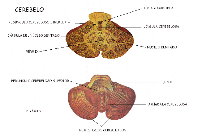 El cerebelo.- El cerebelo está situado inferior y posteriormente al cerebro y encima del tronco encefálico. Es más pequeño que el cerebro (120 gr); tiene forma de una mariposa con las alas extendidas. Consta de tres partes: dds